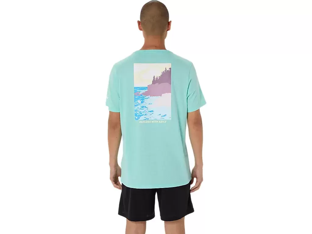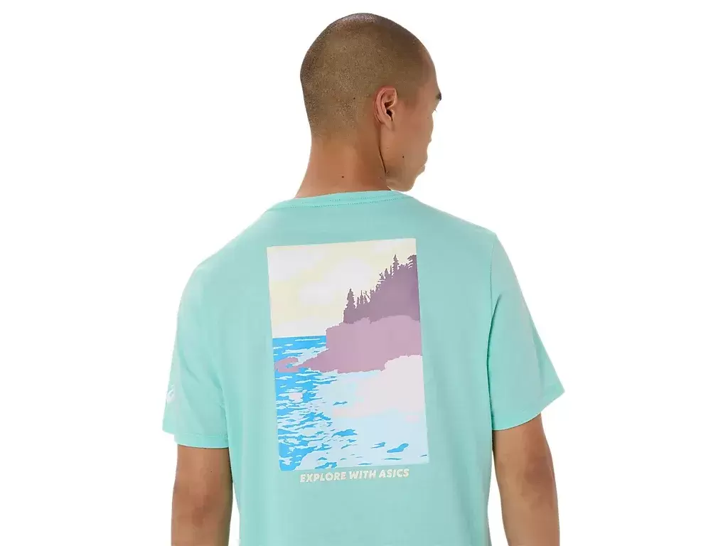 This comfortable knit short sleeve tee takes inspiration from scenic seascapes. The back graphic features the phrase, “”EXPLORE WITH ASICS”” that’s complemented with a coastal tree-lined design.